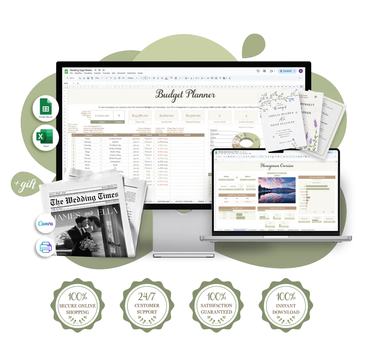 7 dedicated sheets to organize every booking, budget and detail. The best part of planning!